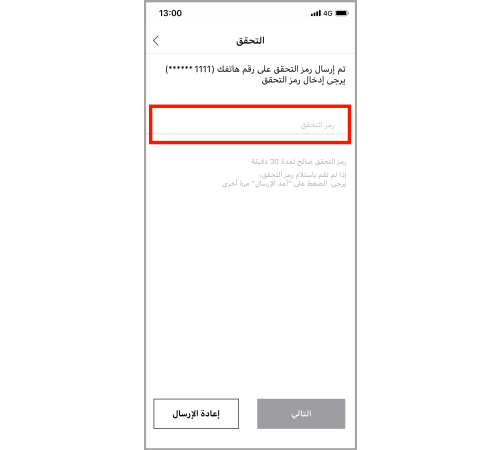 يتم إرسال رمز التحقق عبر الرسائل القصيرة إلى هاتفك الذكي.