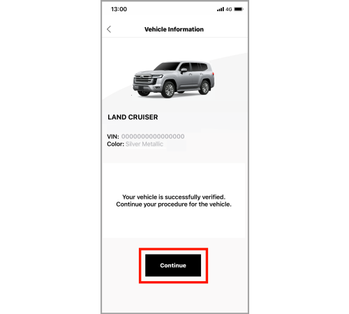 Once the registration completes, you will see a page that shows successful vehicle registration. Tap "Continue" and move to the next step.