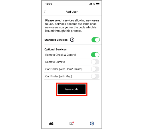 Set the services you want to grant to the user, and then tap "Issue code". (Connected Service)